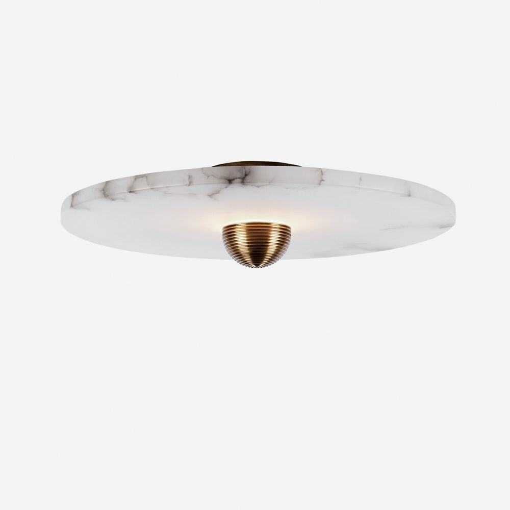 Inspired by the linear plains of the Flemish landscape, the ANVERS collection embodies the low-lying profile of the terrain with its refined silhouette, whilst creating maximum impact through its exquisite disc of natural alabaster stone. The translucent disc of honed alabaster is encased within solid brass, creating a pure and elegant piece. The natural striations within the alabaster, produce an individual and distinctive feature.