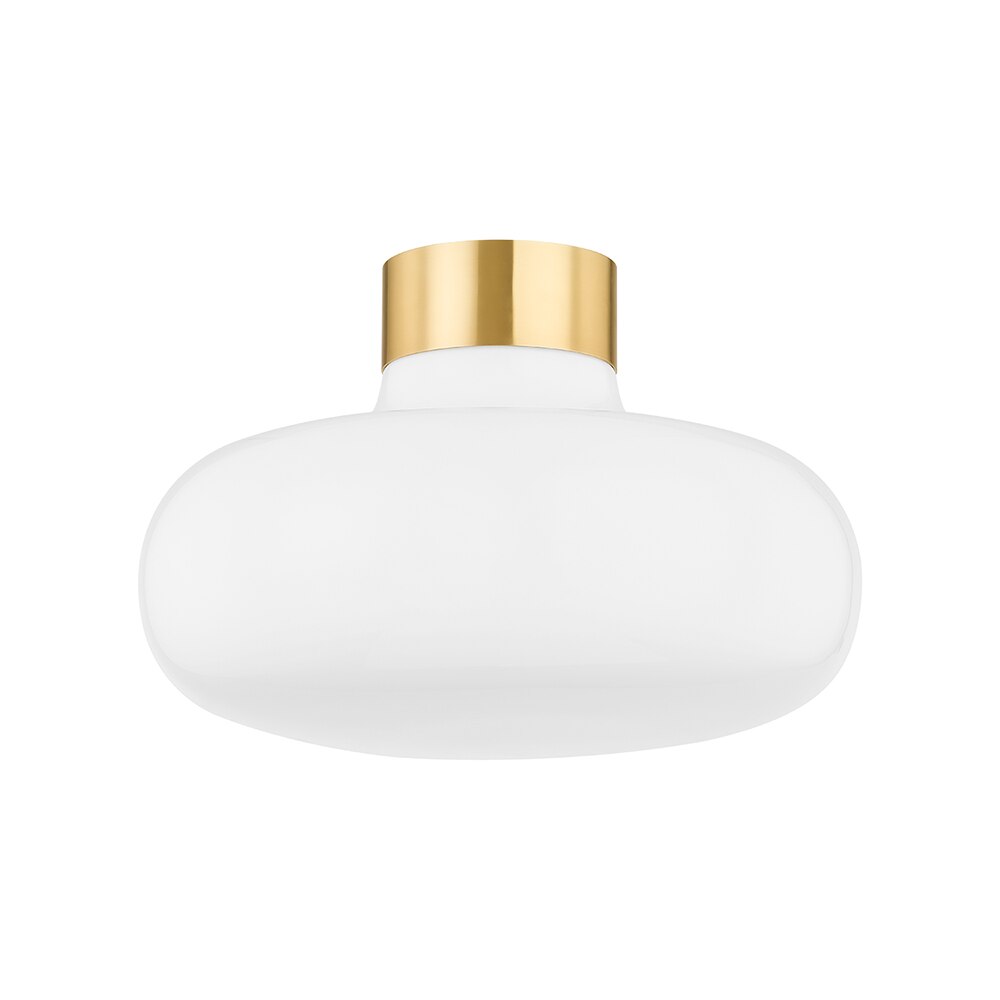 Add a modern retro sensibility to the ceiling with this rounded blown opal glossy glass shade capped by a ring of Aged Brass. The soft shape and clean metal details work with a variety of styles, making this design the perfect way to elevate the lighting in spaces throughout the home.
