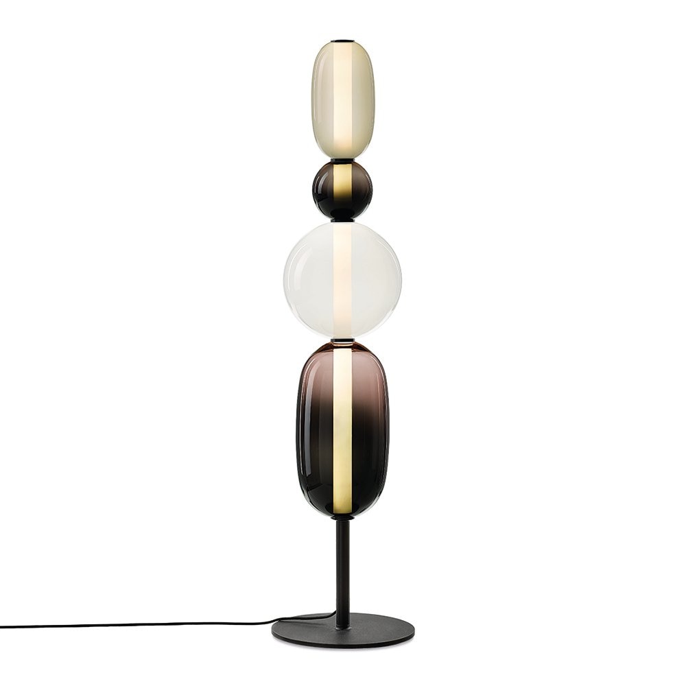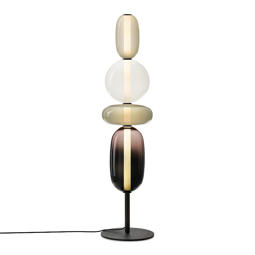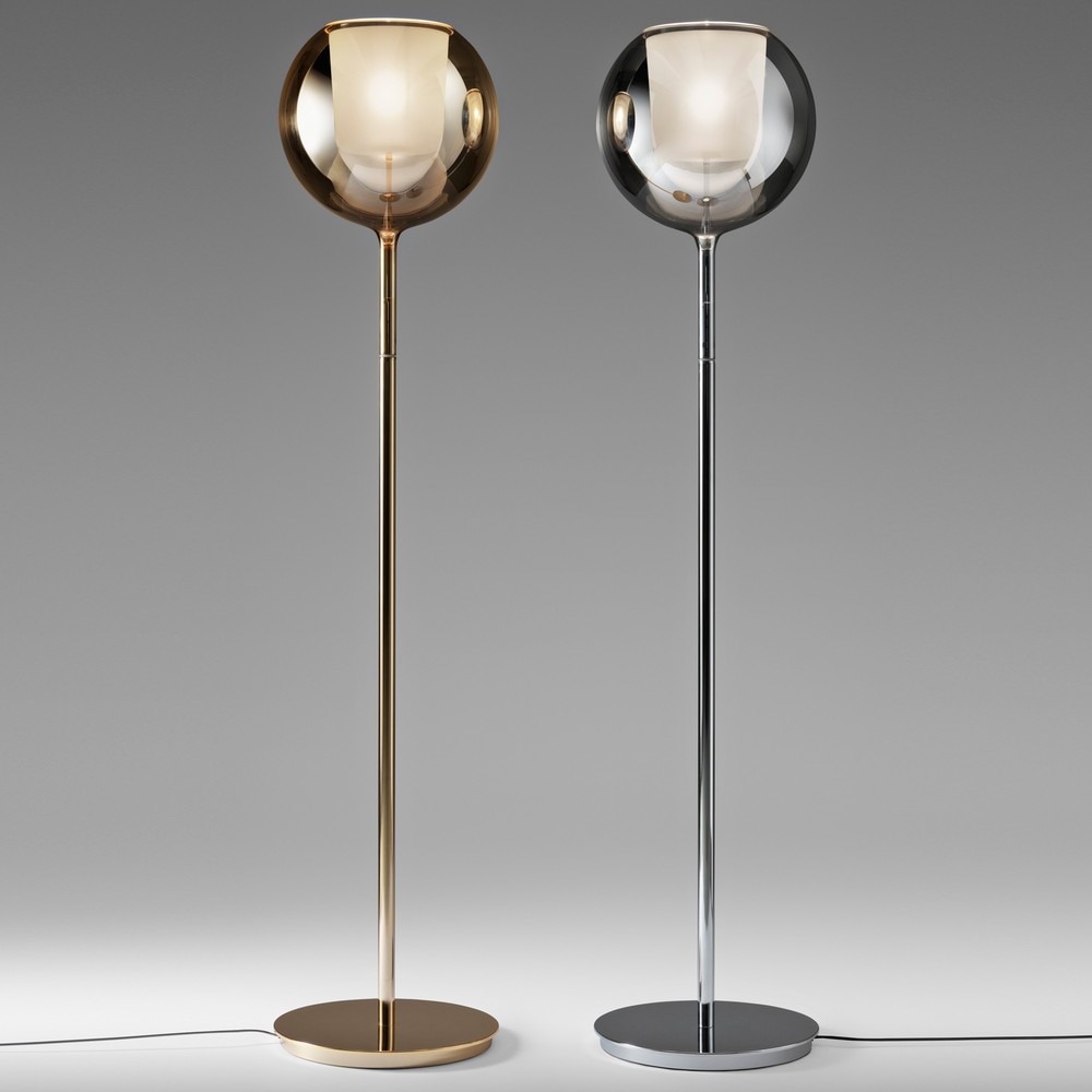 Gigi Grand floor lamp was created by Darmes, in collaboration with Verre d'Onge, to be a sensual experience. By combining the two-toned fade between opaque and transparent glass in the lower diffuser, Gigi Grand floor light appears to float effortlessly upon a shaft of light. Meanwhile, the rounded upper diffuser refracts the upward integrated LED, erupting with joyful vivacity.