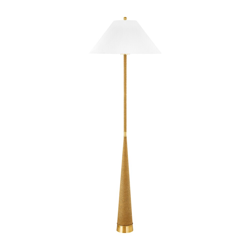 Extremely usable yet trend forward, this striking floor lamp makes a gorgeous organic statement. A slender natural raffia-wrapped stem, tapered at the bottom and straight at the top, has an Aged Brass band at the middle, creating a modern hourglass-like silhouette. A tapered white linen shade and round Aged Brass finial complete the look.