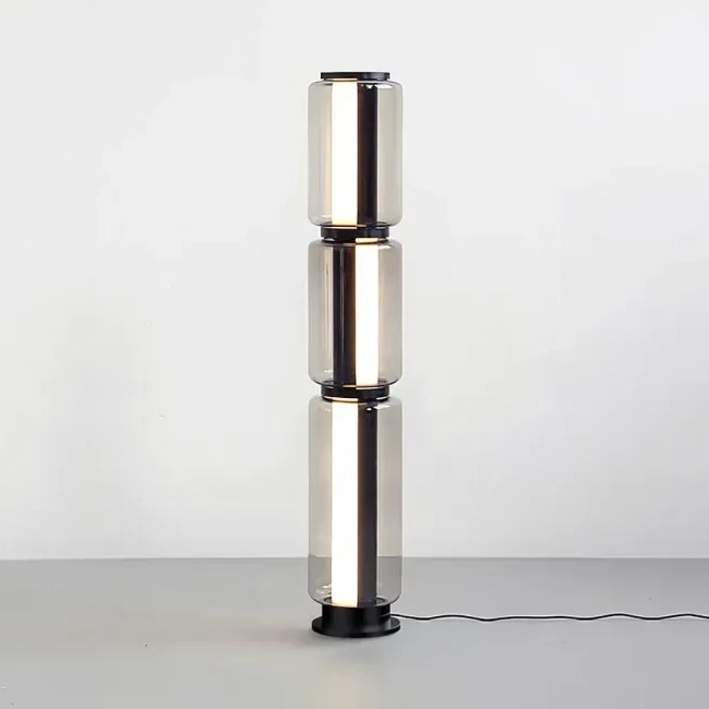 A stunning fusion of modern elegance and refined craftsmanship. Its metal structure in a light gold finish provides a luxurious foundation, while the coloured blown glass body and soft fabric shade add a touch of artistic flair, casting a warm and inviting glow that transforms any space into a haven of style and comfort. Floor lamp with metal structure in light gold finish, coloured blown glass body and fabric shade. Available in different colours.