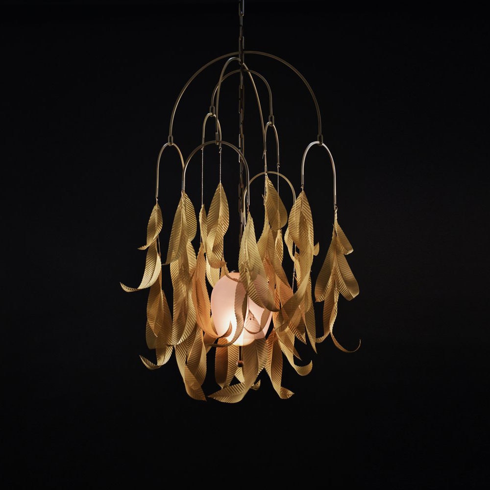 Suspension and ceiling lamps with transparent or etched glass leaves and metal decoration with nickel or matte gold finish.