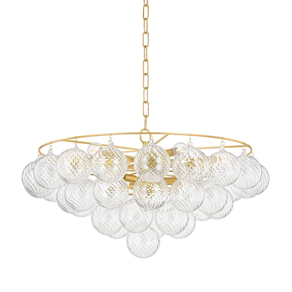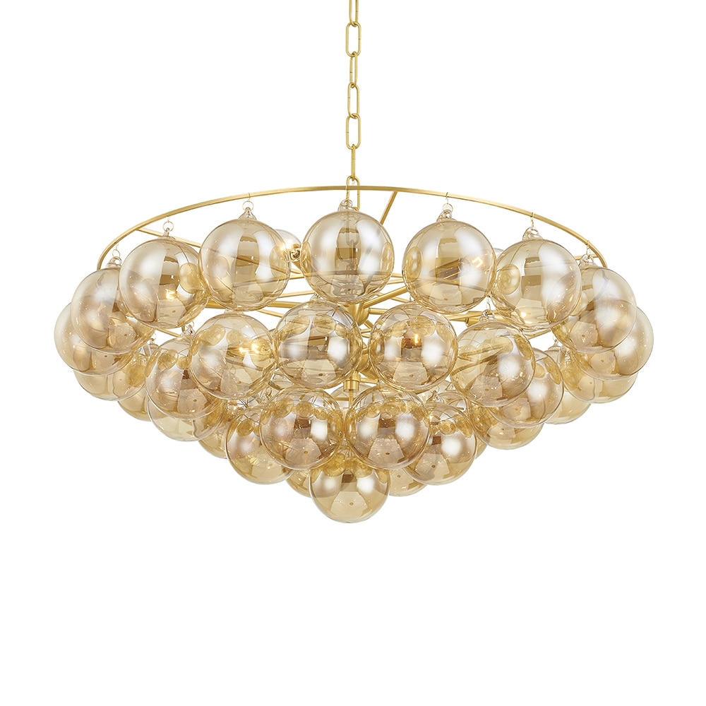 With inspiration from flowers, Sofie Refer has designed the chandelier collection, Apiales. The collection consists of chandeliers with 9 or 18 mouth-blown glass globes. A ceiling mounted version with 9 globes is also available. From a specially-produced canopy, the arms unfold like flower stalks from which light is spread with grace. Suitable for residential homes, restaurants and hotels. Apiales 18 with its 89 cm in diameter, will look great as the centrepiece in the foyer, a large living room or over a large dining table. Note that the fixture is manufactured from mouth-blown glass and anodized metal, then applied with a finish to look like brushed brass.