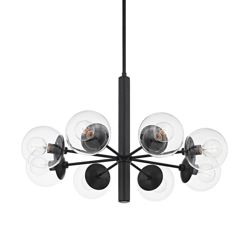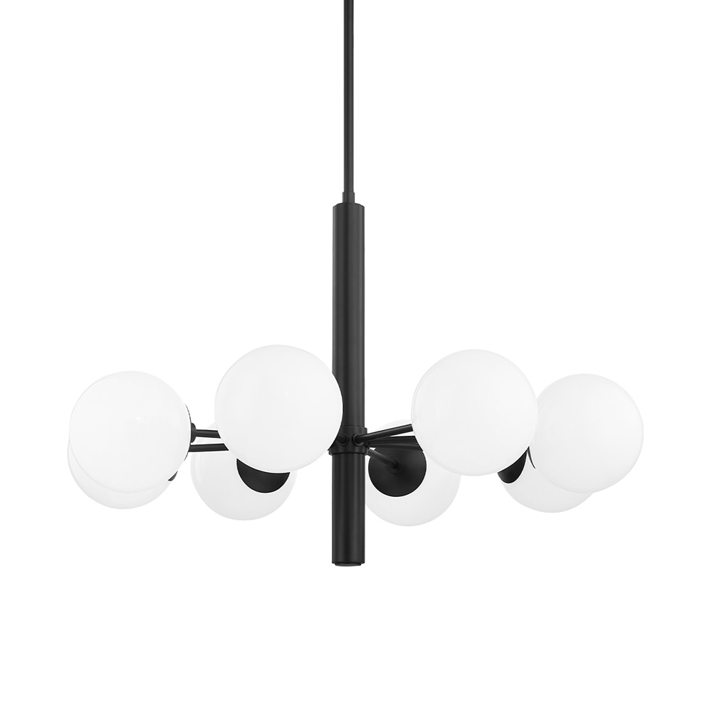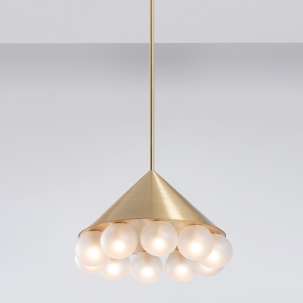 With inspiration from flowers, Sofie Refer has designed the chandelier collection, Apiales. The collection consists of chandeliers with 9 or 18 mouth-blown glass globes. A ceiling mounted version with 9 globes is also available. From a specially-produced canopy, the arms unfold like flower stalks from which light is spread with grace. Suitable for residential homes, restaurants and hotels. Apiales 9 with its 59,5 cm in diameter, fits over the dining table, in the bedroom, or in the hall. Note that the fixture is manufactured from mouth-blown glass and anodized metal, then applied with a finish to look like brushed brass.