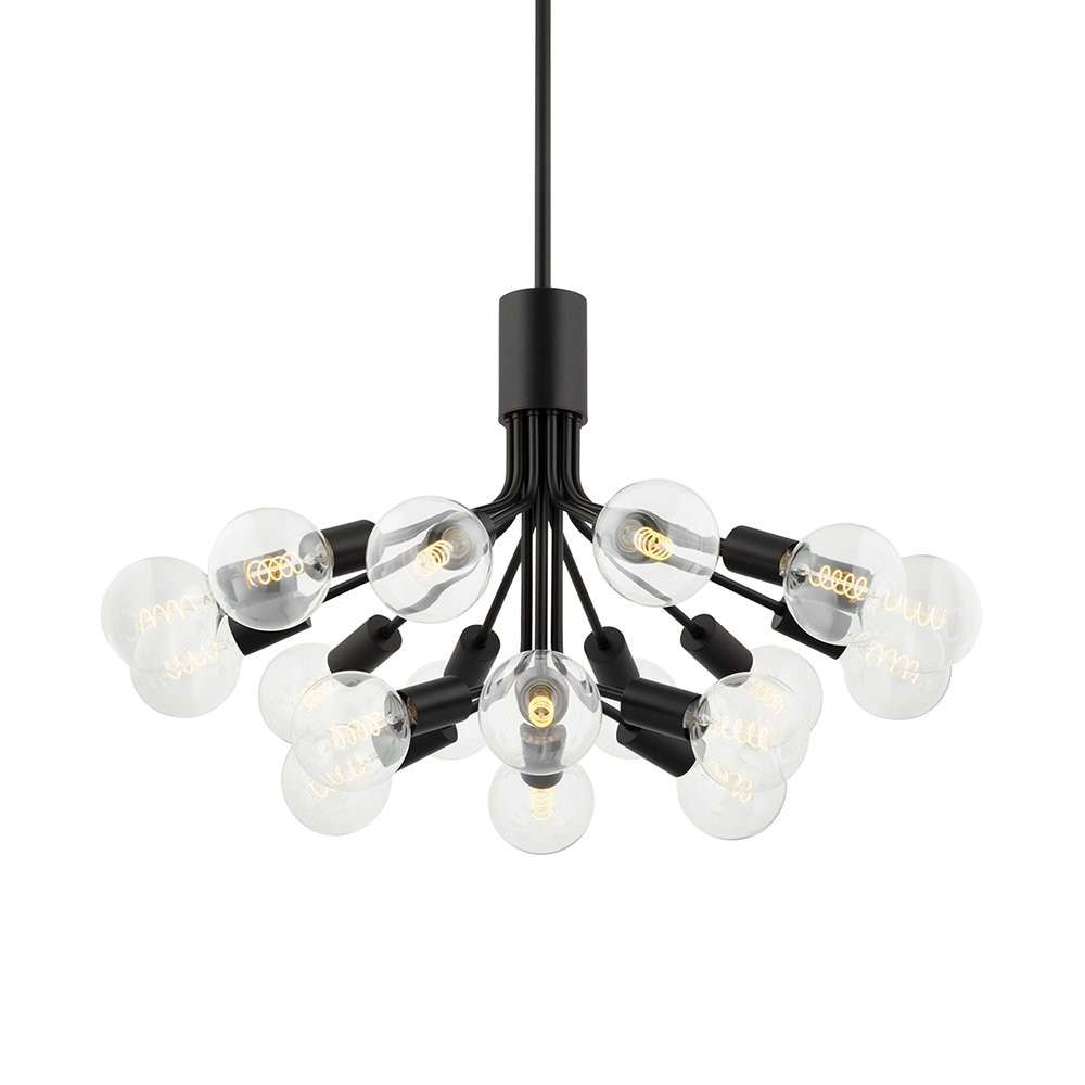 Multiple suspension lamp, available with 7, 13 or 19 points of light. Metallic structure with two finishes: matte chrome with a red textile cable, or texturized bronze finish with a black textile cable