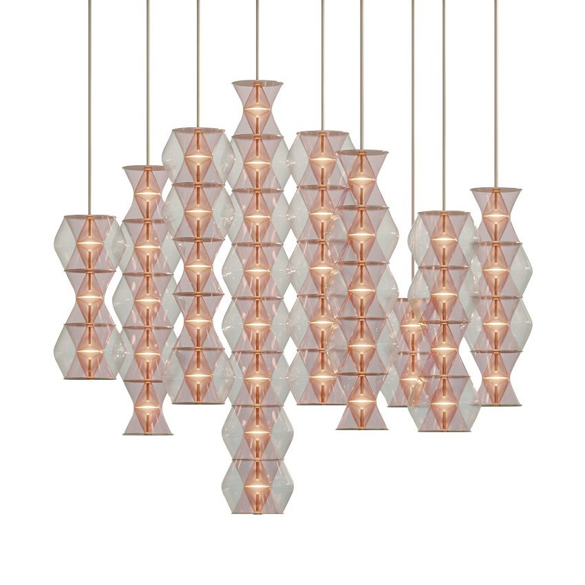 The name for this series of lamps come from the Sanskrit word for the "glow of a lamp." Inspired by ancient Hindu and Buddhist sacred geometry and architecture, this contemporary lighting system in glass and bronze provides beautiful possibilities from a single lamp glowing in the darkness to complex assemblages floating in space.