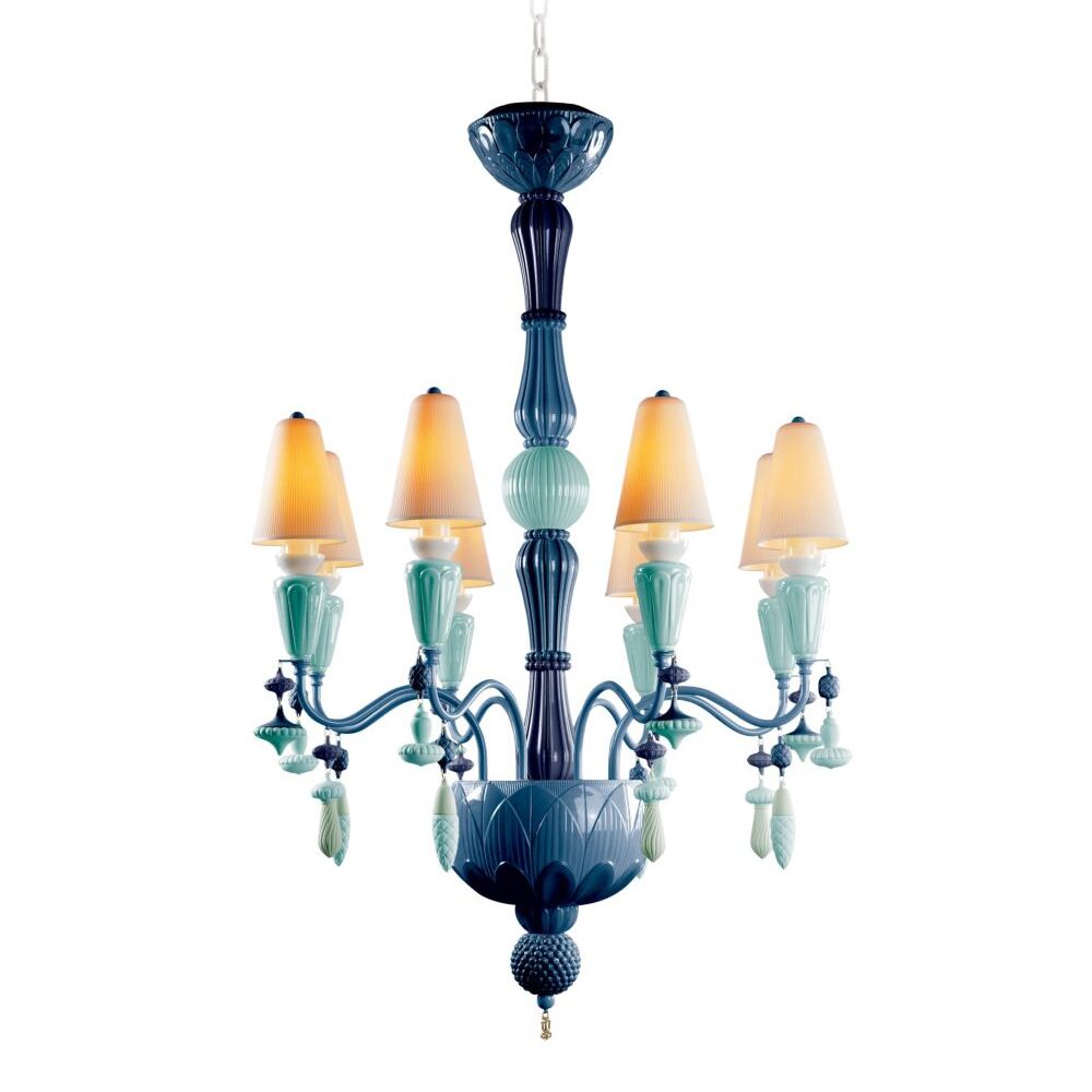 6 light chandelier in clear crystal with Zenith branches worked in 3 dimensions. There are two possible diameters thanks to the branches which may be grouped closer together or separated; the diameter thus varies from 28.08 to 33.93 inches. The center bowl in satin-like crystal is illuminated by LEDs (3000K). The tubing is in polished stainless steel, with two 27.3in extension leads available, and the canopy in nickel-plated polished brass. White taffeta 11.70" diameter lampshades are sold separately. See Accessories tab.