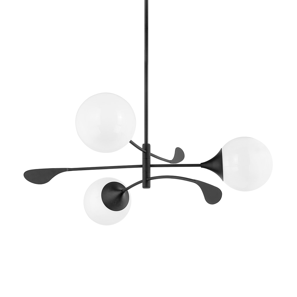 Inspired by the famous fountain at the Piazza di Trevi, the junction of 3 roads which marks the terminal point of an aqueduct. The arms of the Trevi pendant provide a perfectly balanced composition where the lines meet and extend at the precisely formed central pillar. Illuminated with either 3 or 6 matt opal glass shades.