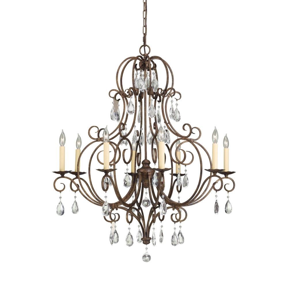 Chandelier comprising a central column with decoration in bevelled diamond cut crystal and cabled branches in the grand tradition of glassmaking. The strength of this chandelier lies in the wealth of its ornamentation comprising spiked prisms alternating with festoons of octagons and scrolls holding bellcaps with sparkling pendants. A red crystal octagon represents the Baccarat signature. Two options for displaying your chandelier: with or without lampshade or hurricane shade.