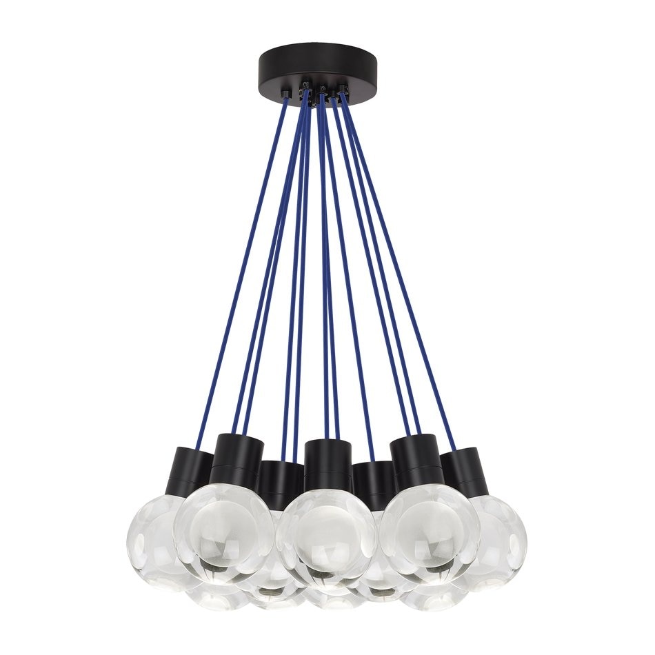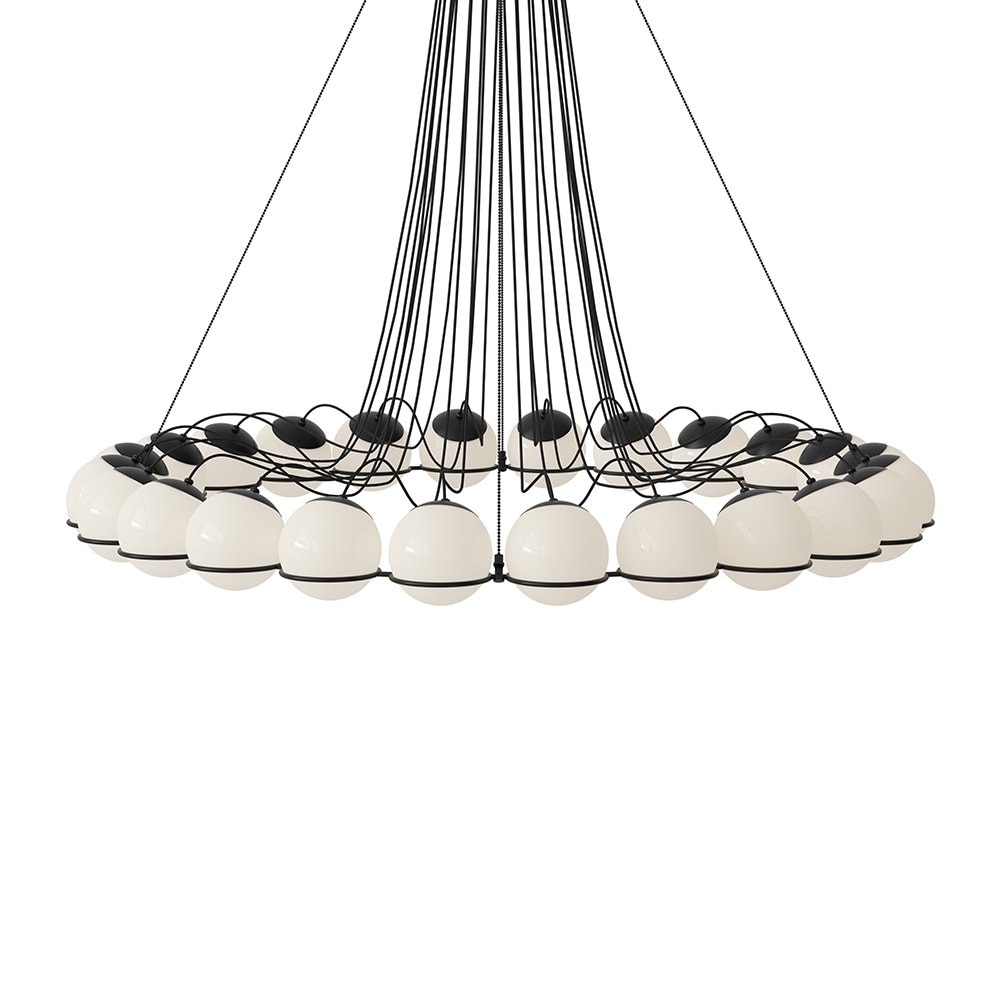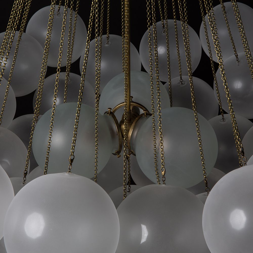 Pricing applies to default 16.5cm diameter clear glass pendants only. Custom sized and coloured pendants are available at extra charge (10in maximum pendant diameter). Additional suspension length and canopy finishes also available at extra charge. Contact us for details. See spec sheet under the Downloads tab for all pendant colours available. 28.19 is a cluster of nineteen 28 pendants hung from a round canopy. The pendants hang in shape of a hexagonal bouquet, bundled together by an adjustable ring, which changes the curvature of the piece and its proportional reading. 28 is an exploration of specificity in manufacturing. Instead of designing form itself, here the intent was to design a system of making that yields form. Individual 28 pendants result from a complex glass blowing technique whereby air pressure is intermittently introduced into and then removed from a glass matrix which is intermittently heated and then rapidly cooled. The result is a distorted spherical shape with a composed collection of imploded inner shapes, one of which acts as a shade for the light source. Standard 28s are made with clear glass exterior spheres and milk white interior lamp holder cavities. 28s are possible with infinite versatility in colour compositions, sizes and shapes.