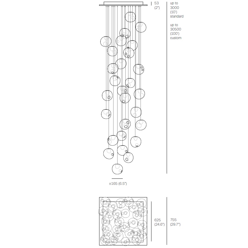 28.28 is a random configuration of twenty-eight 28 pendants hung from a rectangular or square canopy. The drop lengths of the pendants are randomized between a client specified range of heights to variously cluster and scatter. The result is an ambient installation or field of light.