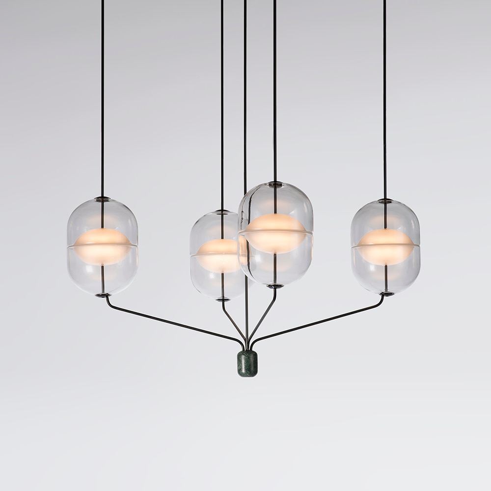 Capsula is a sophisticated and exhilarating light bearing resemblance to a plant cell or seed. The nucleus of the piece is a tubular triplex-glass LED light source, developed by Brokis, that transects the inner shade and translucent external shell to form a notional axis. The layering and overlapping of these three distinct components give rise to dramatic 3D optical effects. The end caps fasten the components together and serve as anchor points for the creative dual suspension straps, which also conceal the power cable and allow for variation in the final positioning of the light. The Capsula collection is offered in sets as well as individual lights that can be combined per customer requirements. From spring 2018, Capsula is fitted with special integrated connectors developed by Brokis to facilitate installation and cleaning.
