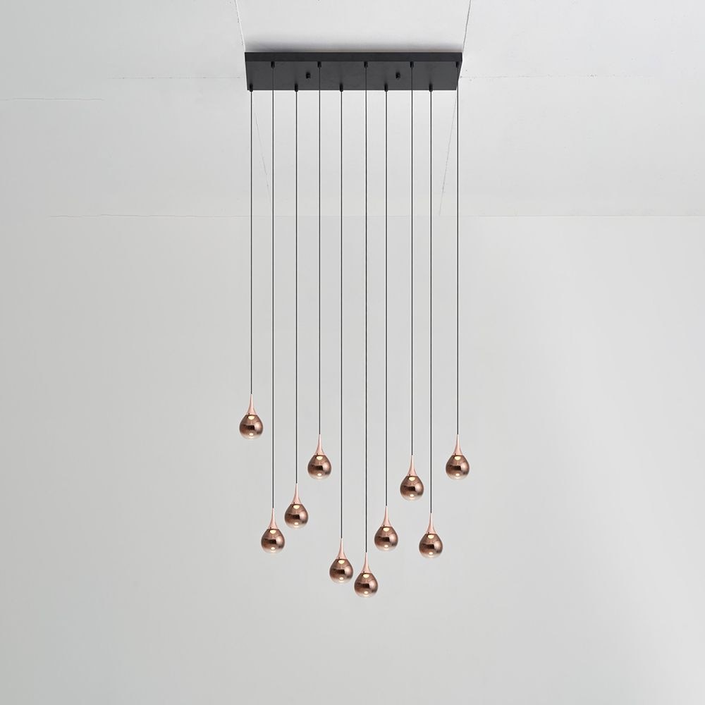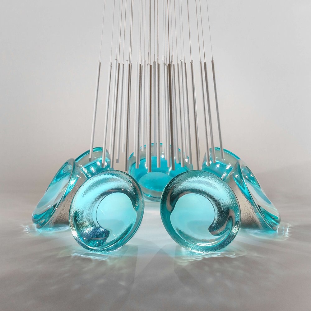 Inspired by the tranquil and mesmerizing light refractions created by water, Mizu is a customizable pendant light from Terzani. Like waterdroplets, no two Mizu are alike, each crystal shape is unique and made meticulously by hand. Using only the clearest crystal (24% lead), Mizu perfectly emulates waters refraction of light, casing amazing patterns around the room, reminiscent of flowing water. Also available in gold leaf.