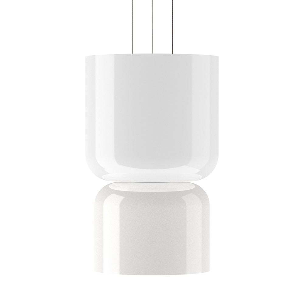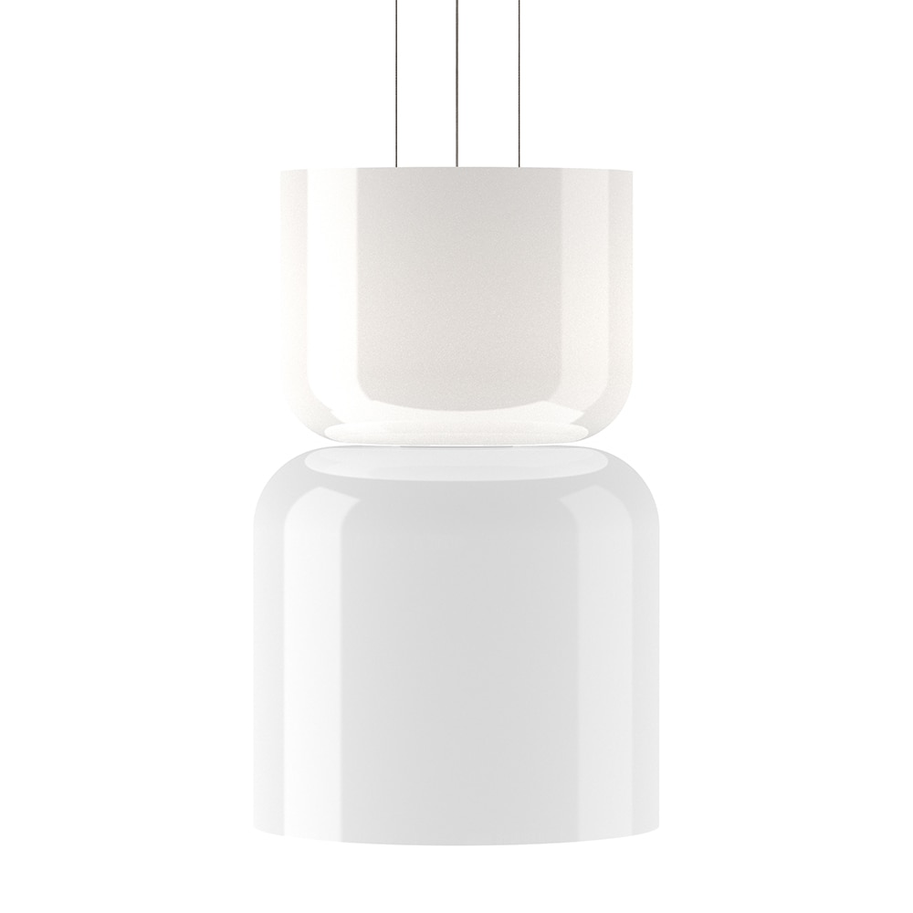 Suspension lamp with a dual aluminium shade, available in two configurations. Multiple matte lacquer finishes available that produce unique combinations. Center ring in black finish. Black cable. Direct and diffused light.