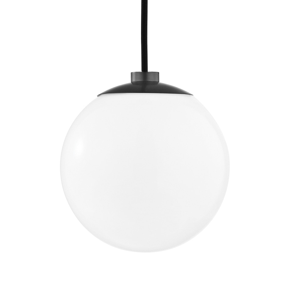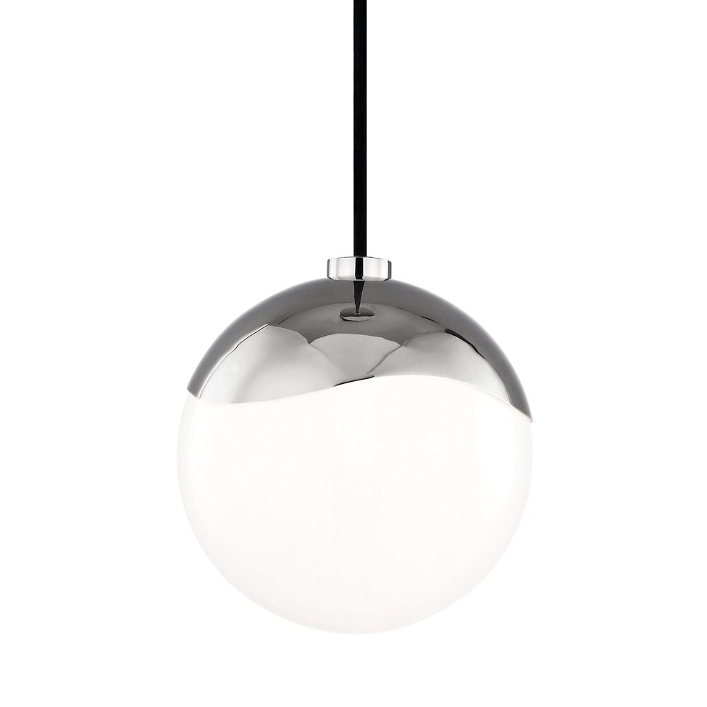 Pendant lamp in triplex blown glass, opal matt white. Metal parts chromed or painted in white. Mounts to a 4” octagonal junction box and is field adjustable.