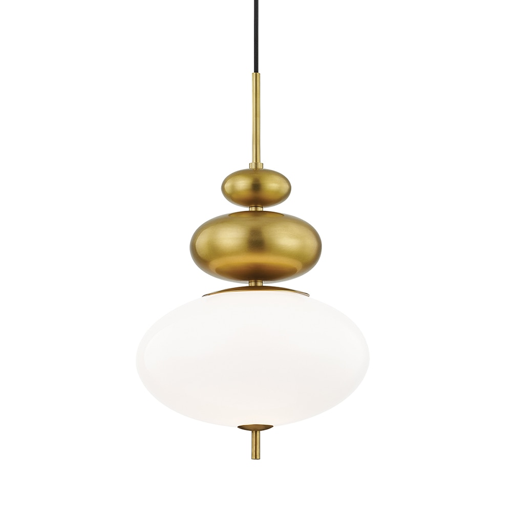 Suspension lamp. Opal diffuser made of two layers of mouth blown glass. Satin brass structure
