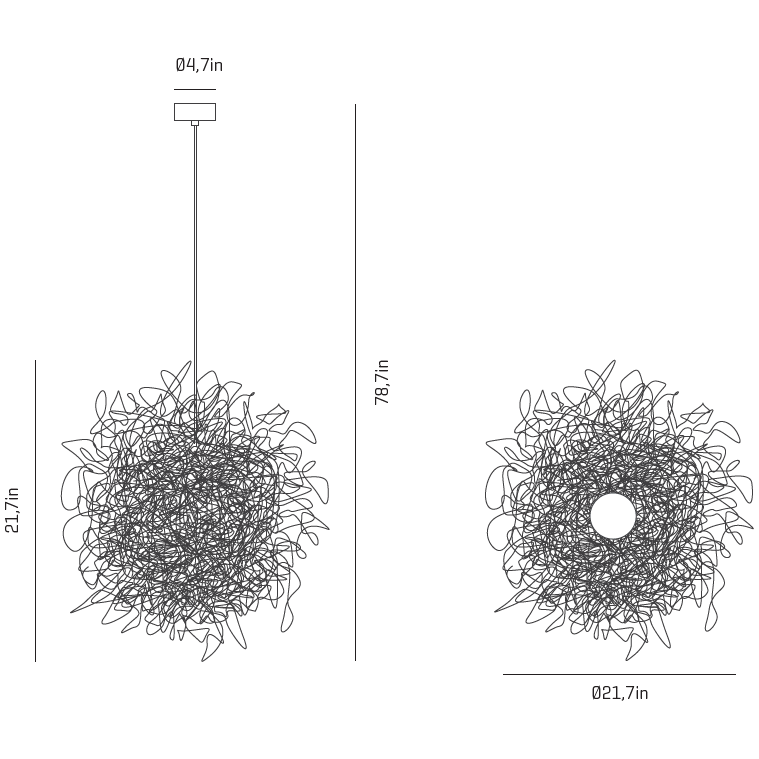 Pili, a single painted stainless steel thread is interwoven, creating random volumes and a harmonious wrapping irregularity, full of charm and mystery, through which the whimsical light escapes. It is available in two sizes, which allows for visually stunning compositions when several units are combined.