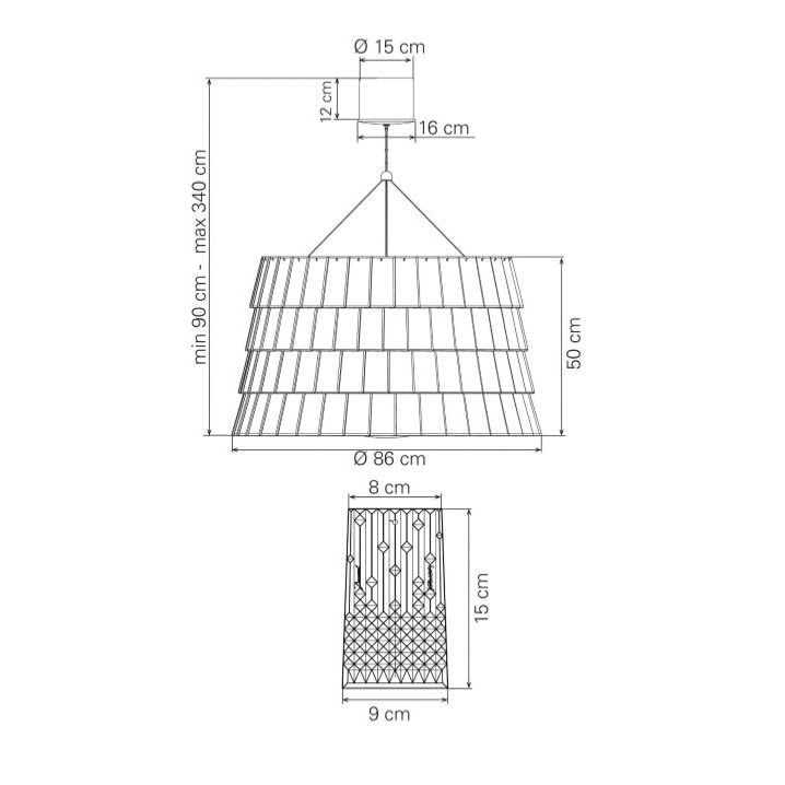 Ceiling unit consisting of a double ring of 63 Frozen-cut crystal tiles (39 on the exterior side and 24 on the interior side) laid on a white finish steel structure. Diffuser in mirrored tempered glass with 3 spots. Upper diffuser in PMMA. Canopy in shiny anodized aluminum covered with a cut clear crystal cup (Ø 15 cm) with a red octagon. 3 zinc-coated steel cables fixed directly to the ceiling. The transparent electric cable goes all along one of the steel cables and enters by the canopy side.